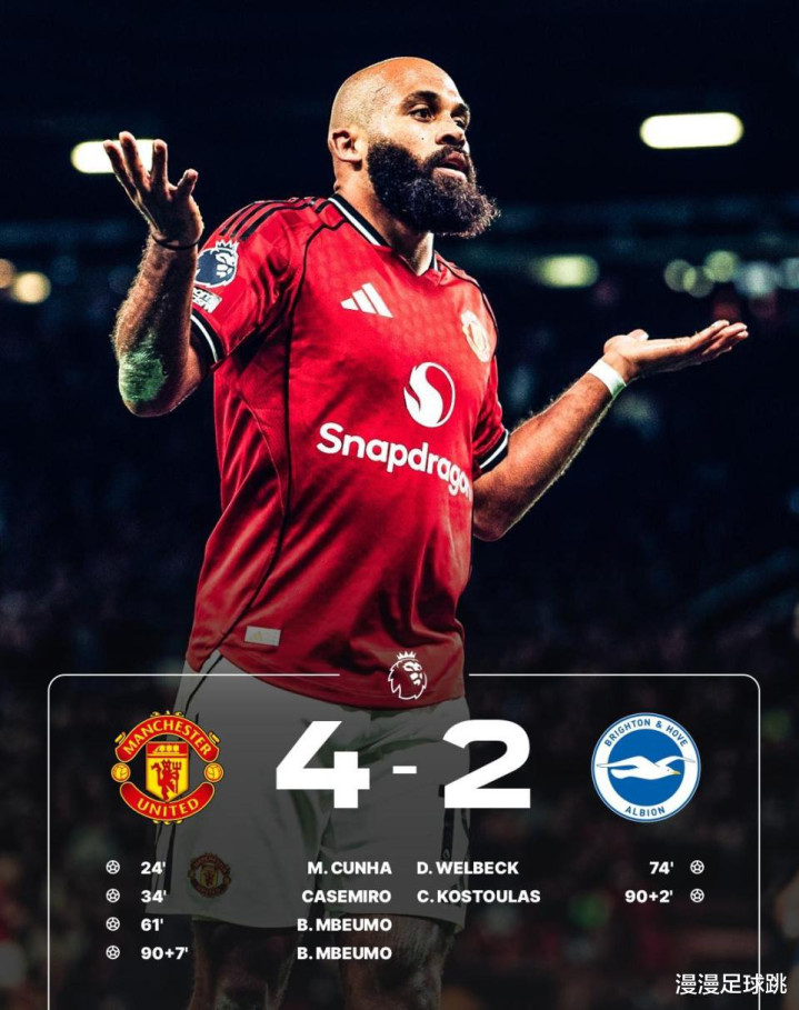 但在伤停补时第96分钟,姆伯莫站了出来,单刀再下一城,梅开二度锁定胜局,曼联4-2布莱顿。